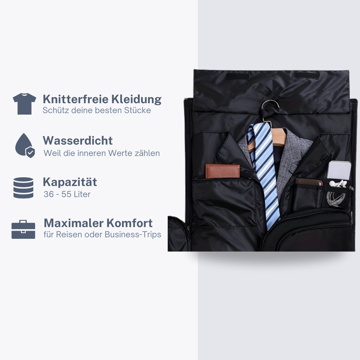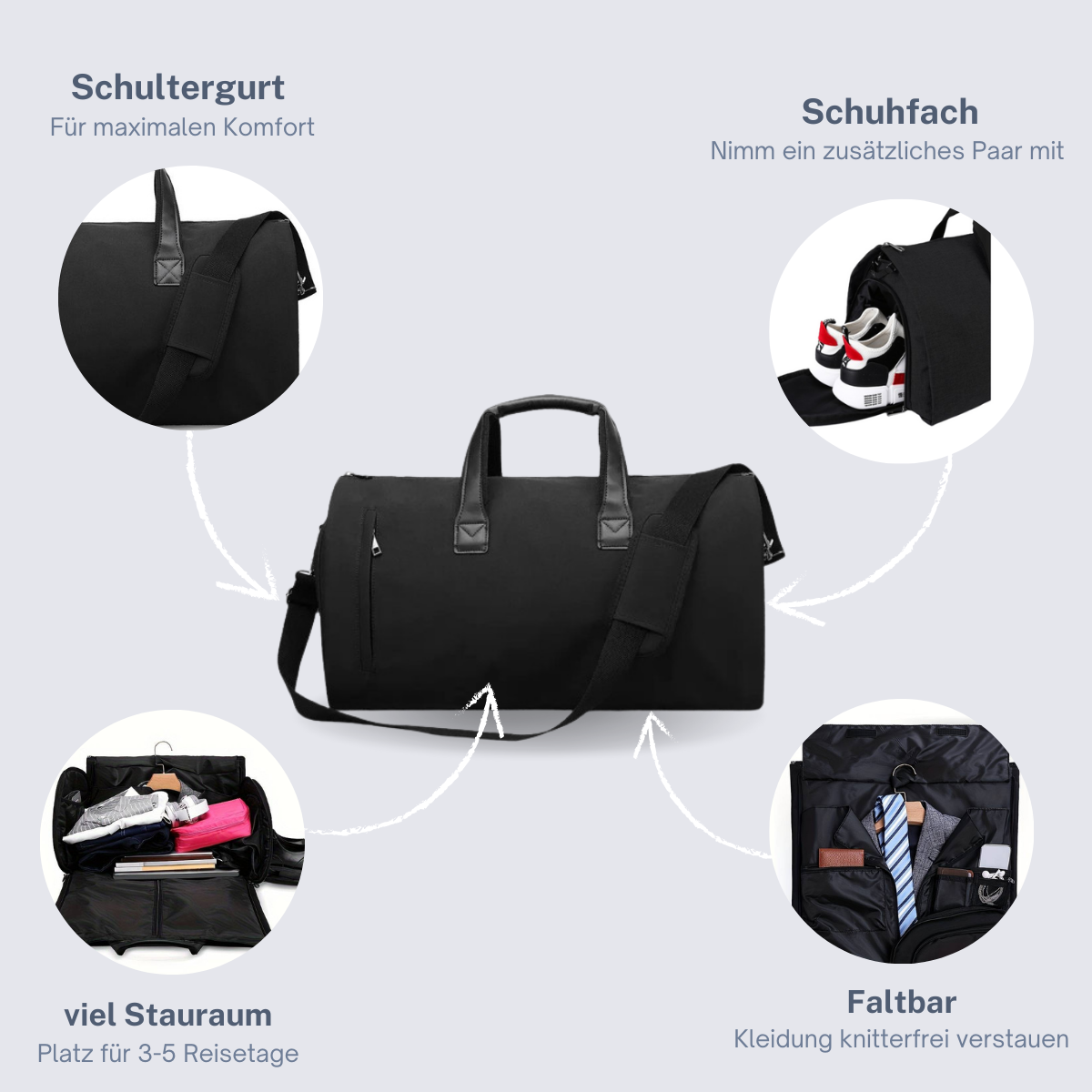 Mit unserer faltbaren Reisetasche reisen Sie clever und stilvoll. Dank ihres intelligenten Designs können Sie nicht nur 36 bis 55 Liter Gepäck problemlos verstauen, sondern auch sicher sein, dass Ihre Hemden und Anzüge knitterfrei ankommen. Packen Sie Ihre Sachen ein und freuen Sie sich auf eine reibungslose und faltenfreie Reise!